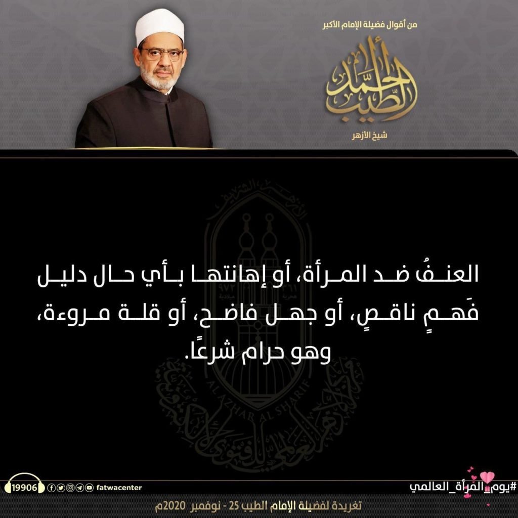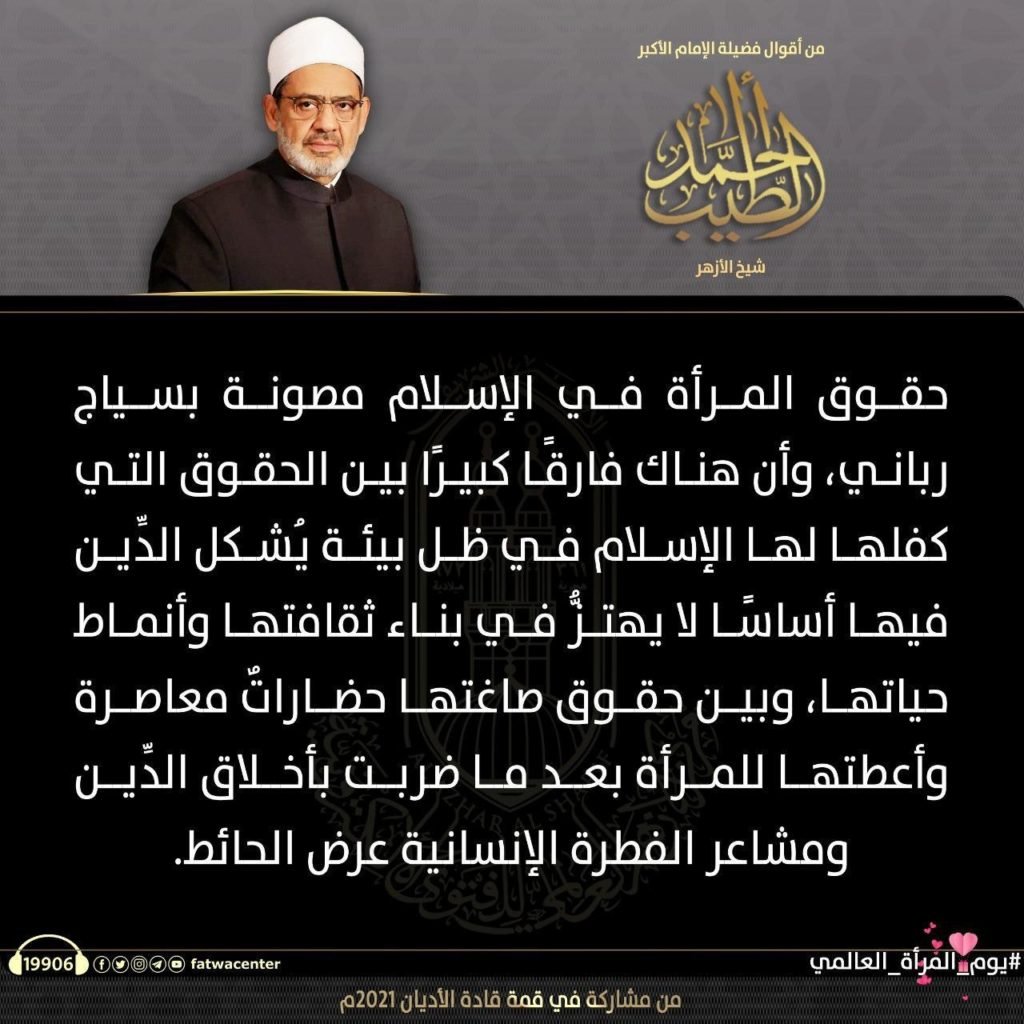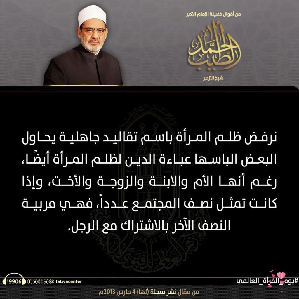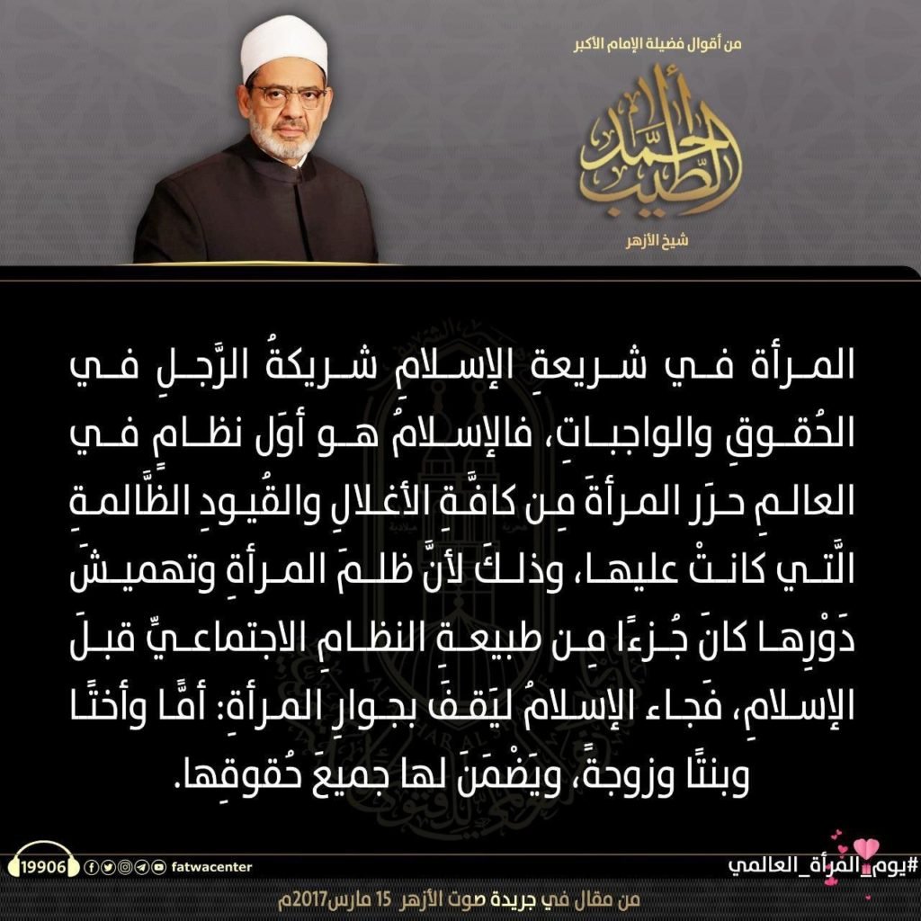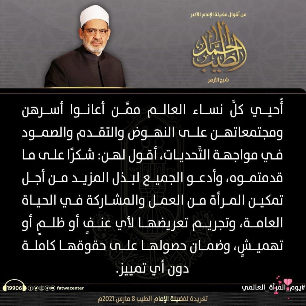 في اليوم العالمي للمرأة، نشر مركز الأزهر للفتوى الإلكترونية أبرز كلمات فضيلة الإمام الأكبر ا.د أحمد الطيب، شيخ الأزهر الشريف، عن دور المرأة ومكانتها في الإسلام
