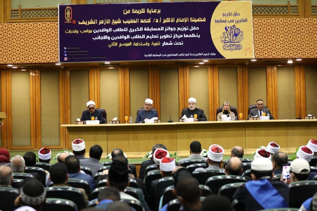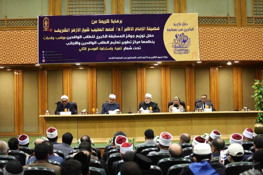جاء ذلك خلال احتفالية توزيع جوائز المسابقة الكبرى للطلاب الوافدين التي نظمها مركز تطوير تعليم الطلاب الوافدين والأجانب بالأزهر الشريف، بمركز الأزهر للمؤتمرات، لتكريم الفائزين في مسابقة مواهب وقدرات في موسمها الثاني تحت عنوان «تنمية واستدامة» للطلاب الوافدين والأجانب الدارسين بالأزهر، وذلك بحضور فضيلة أ.د محمد الضويني، وكيل الأزهر الشريف، ونخبة من علماء وقيادات الأزهر، وقد حصل الفائزون على شهادات شكر وتقدير، مع جوائز مالية قيمتها مِئتان وستون ألف جنيه مصري لمئة وستين فائزًا، وستنشر أسماؤهم على بوابة الأزهر الإلكترونية، ومجلة الأزهر الشريف، وجريدة صوت الأزهر.