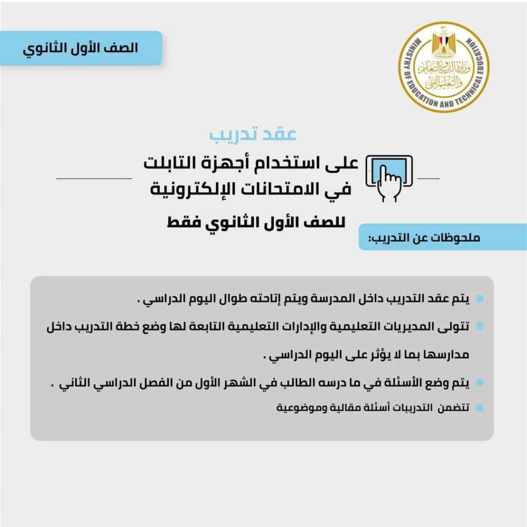 أكدت وزارة التربية والتعليم والتعليم الفنى، أنه في تطوير المنظومة التعليمية وحرصًا على مصلحة أبنائها الطلاب فقد تقرر عقد تدريب على استخدام أجهزة التابلت في الامتحانات الإلكترونية لجميع الطلاب بالصف الأول الثانوي (فقط) اعتباراً من يوم الأحد 2022/3/20 طبقاً للجدول المرفق مع مراعاة الآتي: