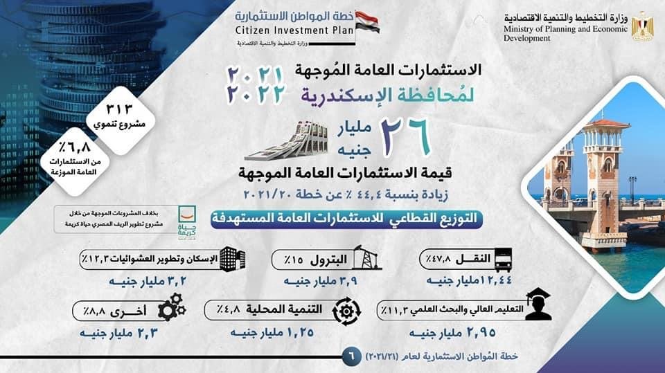 وزارة التخطيط تعلن خطة المواطن الاستثمارية لمحافظة الإسكندرية لعام 21/2022