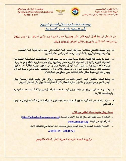 وأضافت أنه عادة ما يشهد هذا الفصل تقلبات جوية حادة وسريعة حيث تتكون المنخفضات الخماسينية القادمة من الصحراء الليبية وتتجه إلى الصحراء الغربية لمصر يصاحبها رياح جنوبية غربية نشطة وهو ما يعرف (برياح الخماسين) والتي تكون مثيرة للرمال والأتربة وتؤدى الى تدهور الرؤية الأفقية على الطرق ويصاحب ذلك موجات شديدة الحرارة ، ثم يحدث انقلاب حراري وانخفاض ملحوظ في درجات الحرارة.