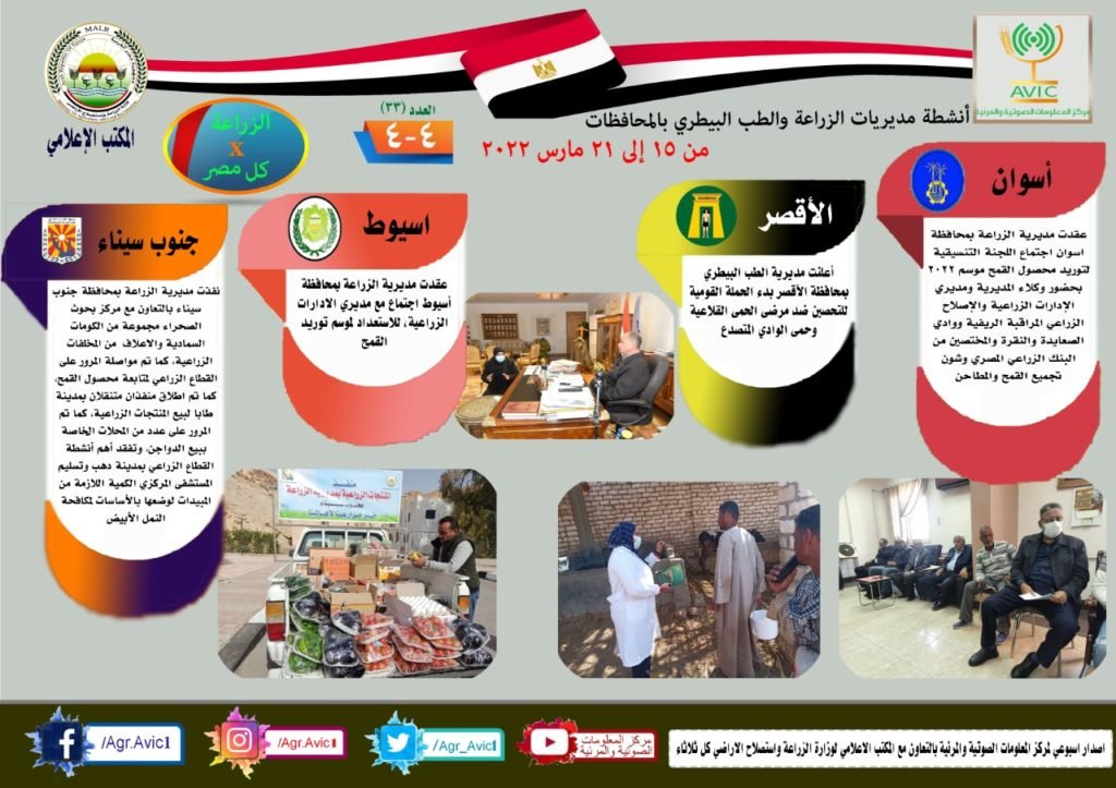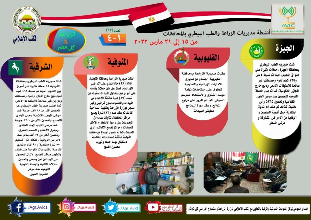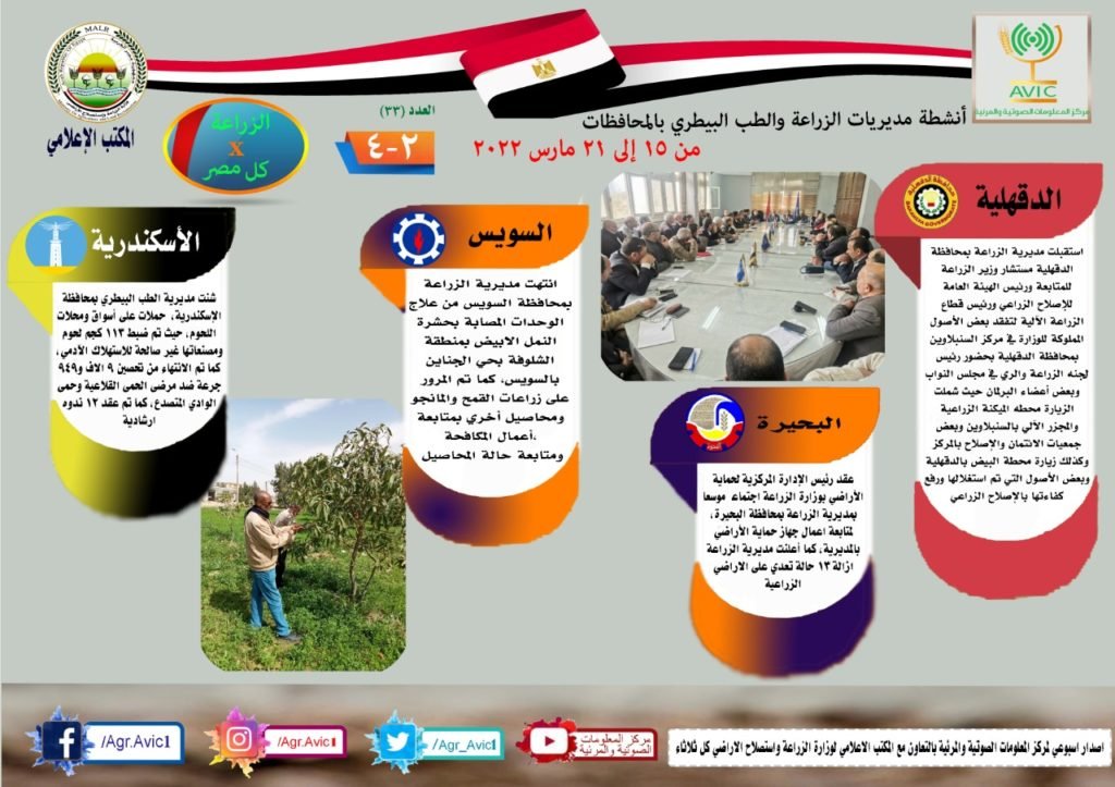 أصدر مركز المعلومات الصوتية والمرئية التابع لوزارة الزراعة واستصلاح الأراضي، والمكتب الاعلامي للوزارة، العدد رقم 33 من اصدار: “الزراعة في كل مصر” بالانفوجراف والفيديو، يوضح الجهود والانشطة التي تقوم بها مديريات الزراعة والطب البيطري بمحافظات الجمهورية خلال الفترة من 15 الى 21 مارس الجاري.