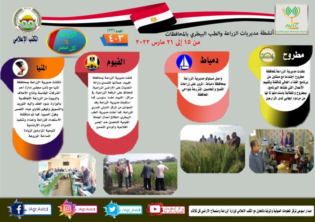 إنفوجراف “الزراعة في كل مصر”.. تعرف على أنشطة وجهود مديريات الزراعة والطب البيطري من 15 وحتى 21 مارس الجاري