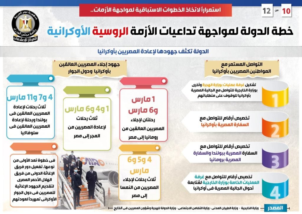 وبشأن جهود إعادة المصريين العالقين بأوكرانيا ودول الجوار، ذكر التقرير أنه تم إطلاق رحلتين لإجلاء المصريين العالقين من رومانيا إلى مصر في 1و6 مارس، وكذلك إطلاق 3 رحلات لإجلاء المصريين من النمسا في 4 و5 و6 مارس.