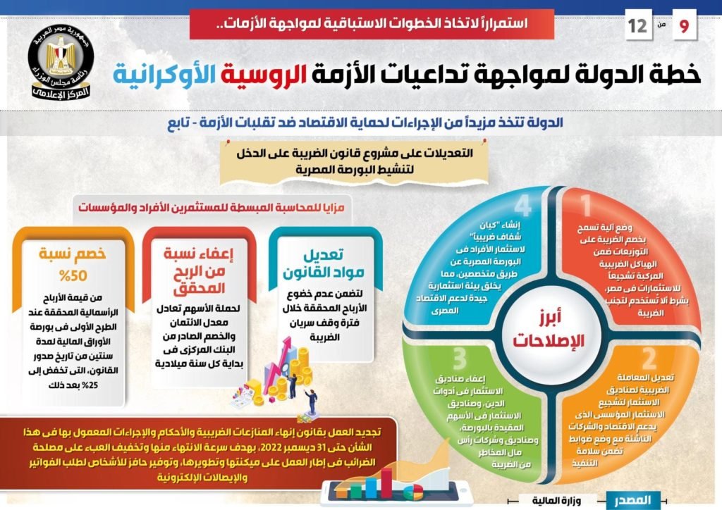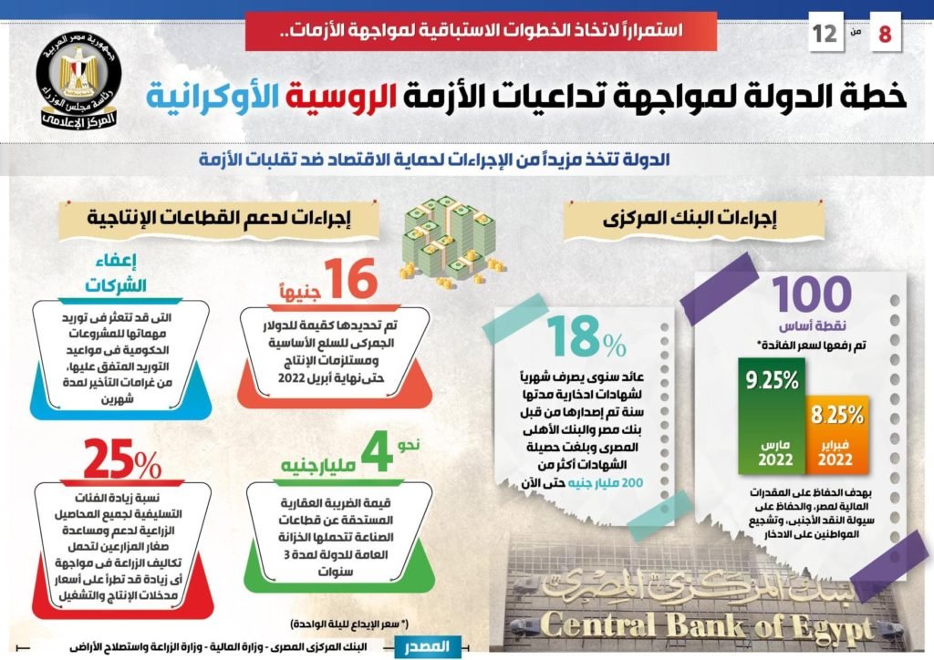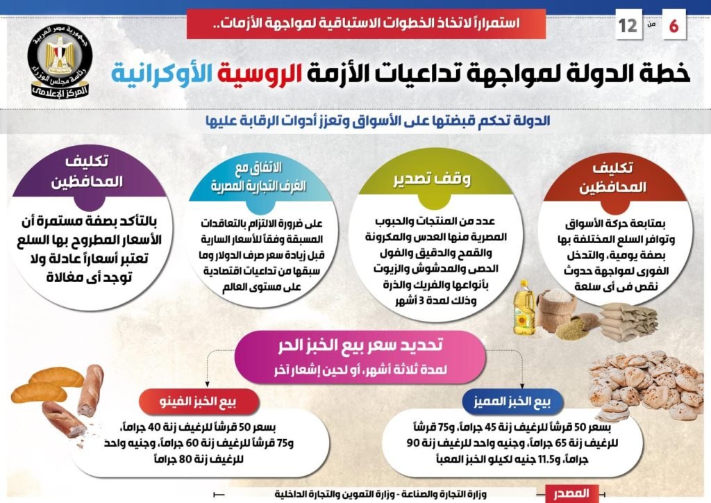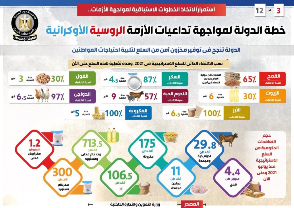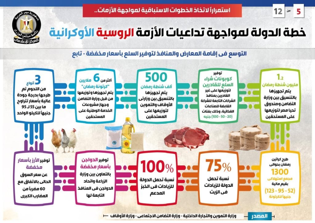 وفي هذا الصدد نشر المركز الإعلامي لمجلس الوزراء تقريراً تضمن إنفوجرافات تسلط الضوء على جهود الدولة وخطواتها الاستباقية لمواجهة تداعيات الأزمة الروسية الأوكرانية.