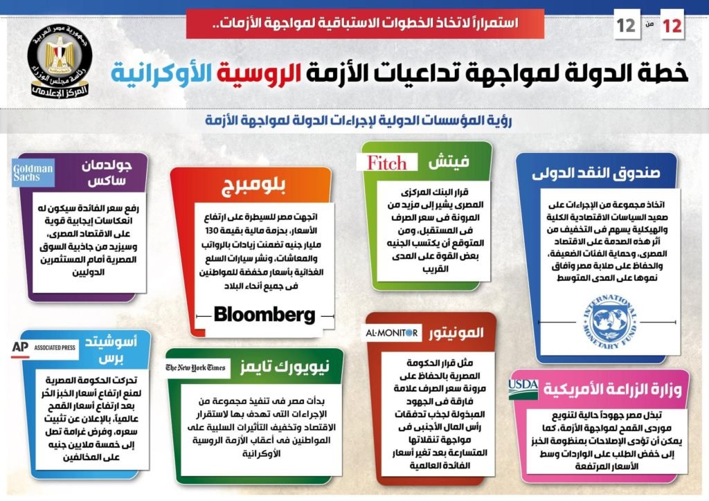 هذا وأشارت بلومبرج إلى أن مصر اتجهت للسيطرة على ارتفاع الأسعار، بحزمة مالية بقيمة 130 مليار جنيه تضمنت زيادات بالرواتب والمعاشات، ونشر سيارات السلع الغذائية بأسعار مخفضة للمواطنين في جميع أنحاء البلاد، أما نيويورك تايمز فقد ذكرت أن مصر بدأت في تنفيذ مجموعة من الإجراءات التي تهدف بها لاستقرار الاقتصاد وتخفيف التأثيرات السلبية على المواطنين في أعقاب الأزمة الروسية الأوكرانية.