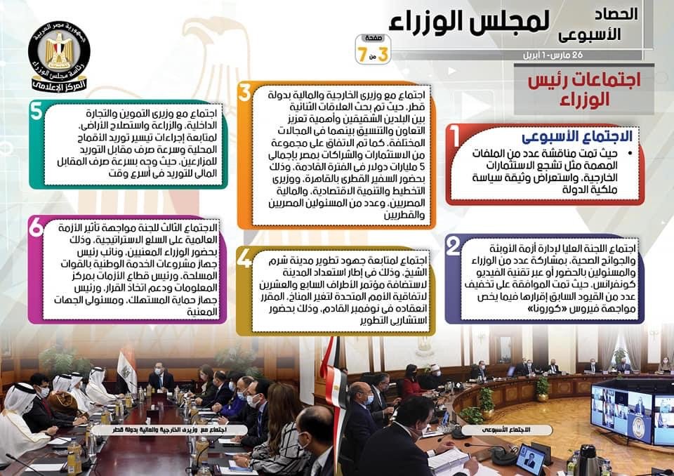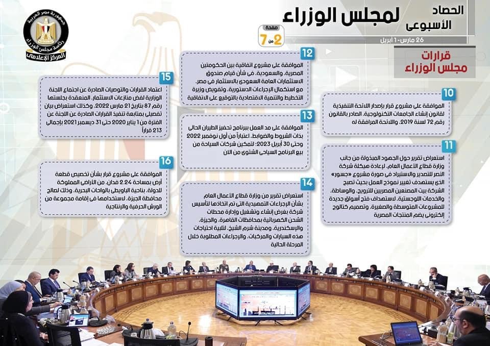 نشر المركز الإعلامي لمجلس الوزراء، تقريراً شمل إنفوجرافات سلط من خلالها الضوء على الحصاد الأسبوعي لمجلس الوزراء، وذلك خلال الفترة من 26 مارس حتى 1 أبريل 2022، والذي تضمن الموافقة على عدد من القرارات، فضلاً عن الاجتماعات واللقاءات التي عقدها الدكتور مصطفى مدبولي، رئيس مجلس الوزراء، بالإضافة إلى ما قام به من أنشطة.