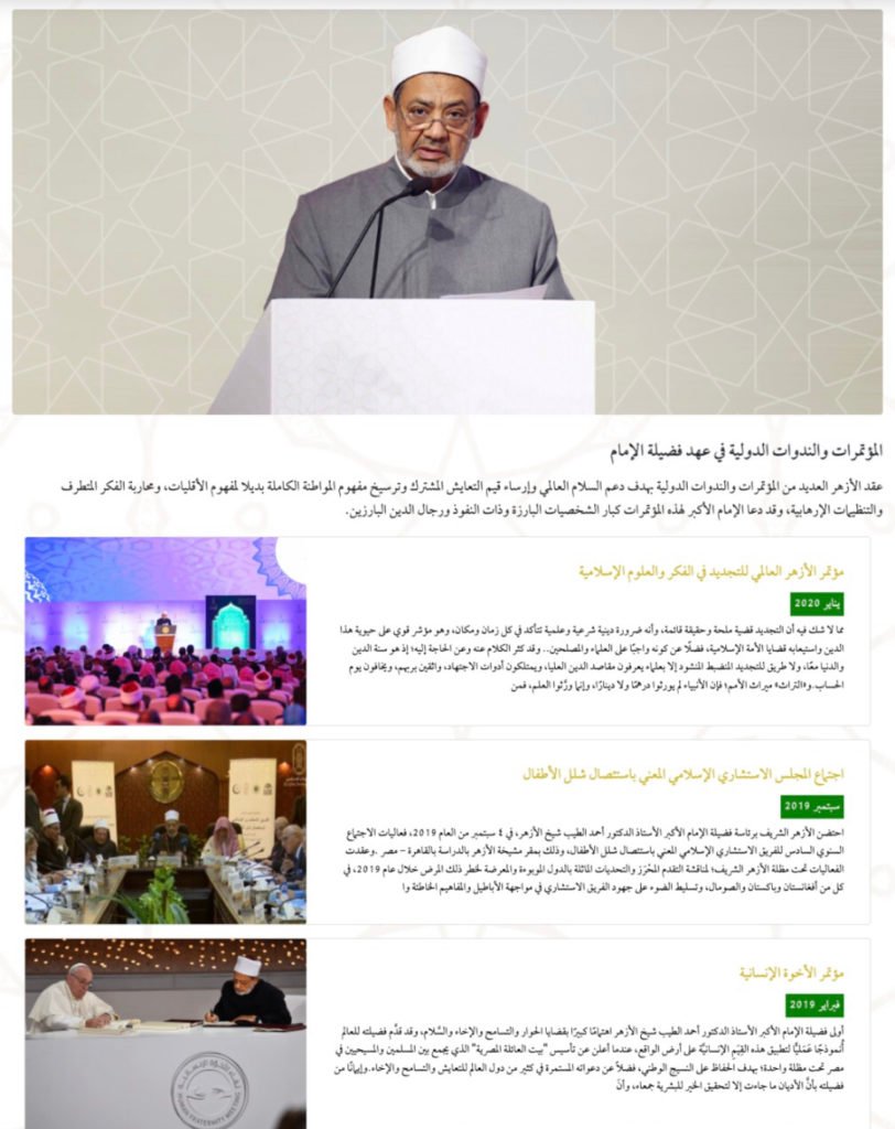 كما يعرض الموقع بتسلسل مختلِف الزيارات الخارجية لشيخ الأزهر في دول العالم وأهميتها وما تضمنته من أعمال، وكذلك الاستقبالات الداخلية لضيوف الأزهر الشريف في مشيخة الأزهر وخصوصا الزيارات التي تتعلق بالرؤساء والأمراء وكبار المسئولين والشخصيات البارزة، ومقولات فضيلته وحلقات البرامج التلفزيونية لفضيلته.