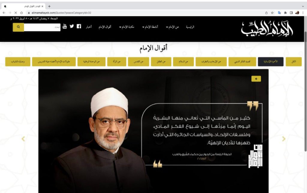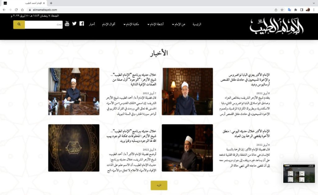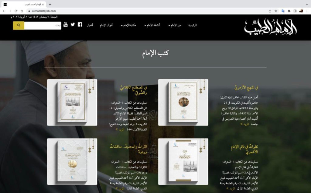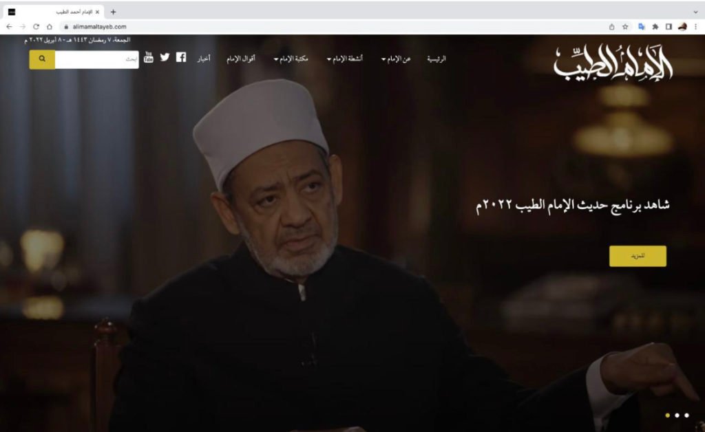 دشُن اليوم الجمعة 7 رمضان 1443هـ الموافق 8 أبريل 2022م الموقع الرسمي لفضيلة الإمام الأكبر أ.د أحمد الطيب، شيخ الأزهر الشريف، رئيس مجلس حكماء المسلمين، لخدمة الباحثين والدارسين والجمهور وإتاحة كل جهود الإمام الطيب ومسيرته موثقة بالنص والصوت والصورة، وتسهيل الوصول إلى كل ما يخص الإمام الطيب في موقع رسمي، وقد تم الإعلان عن إطلاق الموقع اليوم خلال الاحتفال السنوي للجامع الأزهر بمناسبة مرور 1082 عامًا على افتتاح الجامع والصلاة فيه.