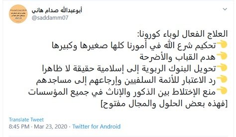 وفي سياق متصل كتب أحد الحسابات التابعة للتيار السلفي عبر تويتر باسم “أبو عبد الله صدام هاني” تغريدة تضمنت أن العلاج الفعال لكورونا يكمن في هدم القباب والأضرحة وتحويل البنوك الربوية لإسلامية لرفع غضب الله عن العباد والقضاء على البلاء.