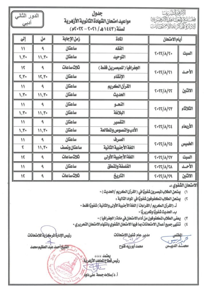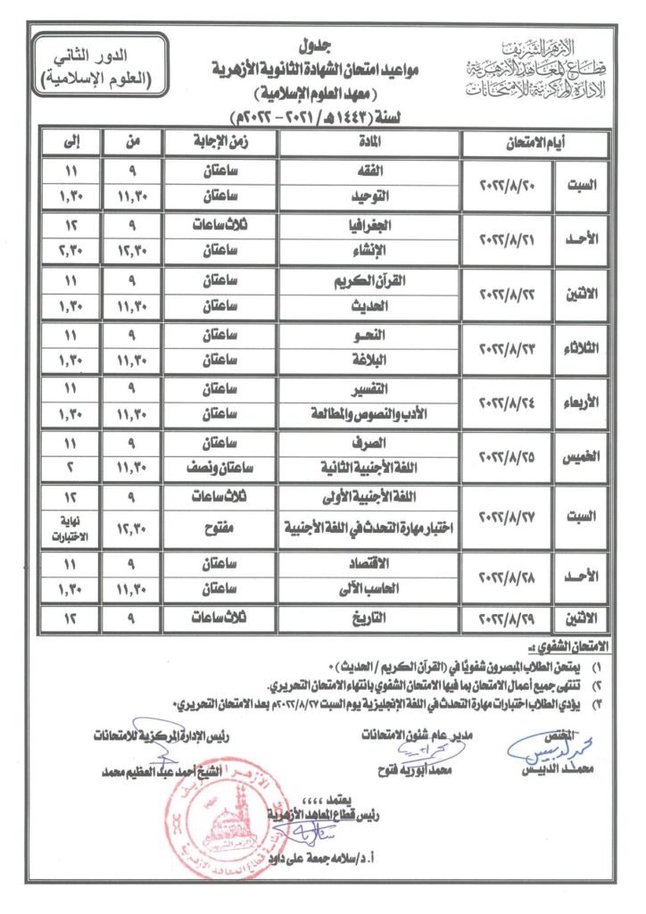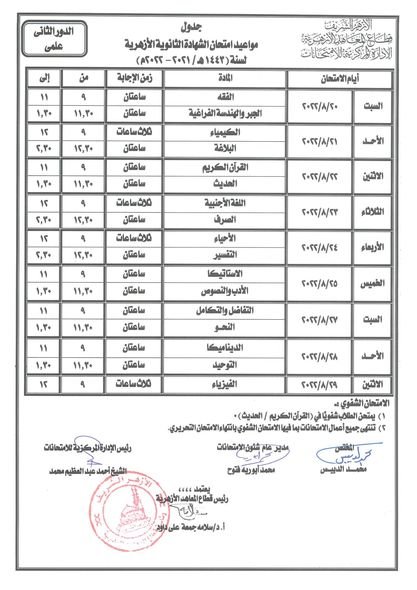 أعلن قطاع المعاهد الأزهرية عن جداول امتحانات الدور الثاني للشهادة الثانوية الأزهرية، حيث من المقرر أن تنطلق في 20 من شهر أغسطس القادم على أن تنتهي يوم 29 من الشهر ذاته، وأن يؤدي طلاب شعبة “العلمي والأدبي والبعوث الإسلامية” الامتحانات بواقع مادتين كل يوم في جميع معاهد الجمهورية.