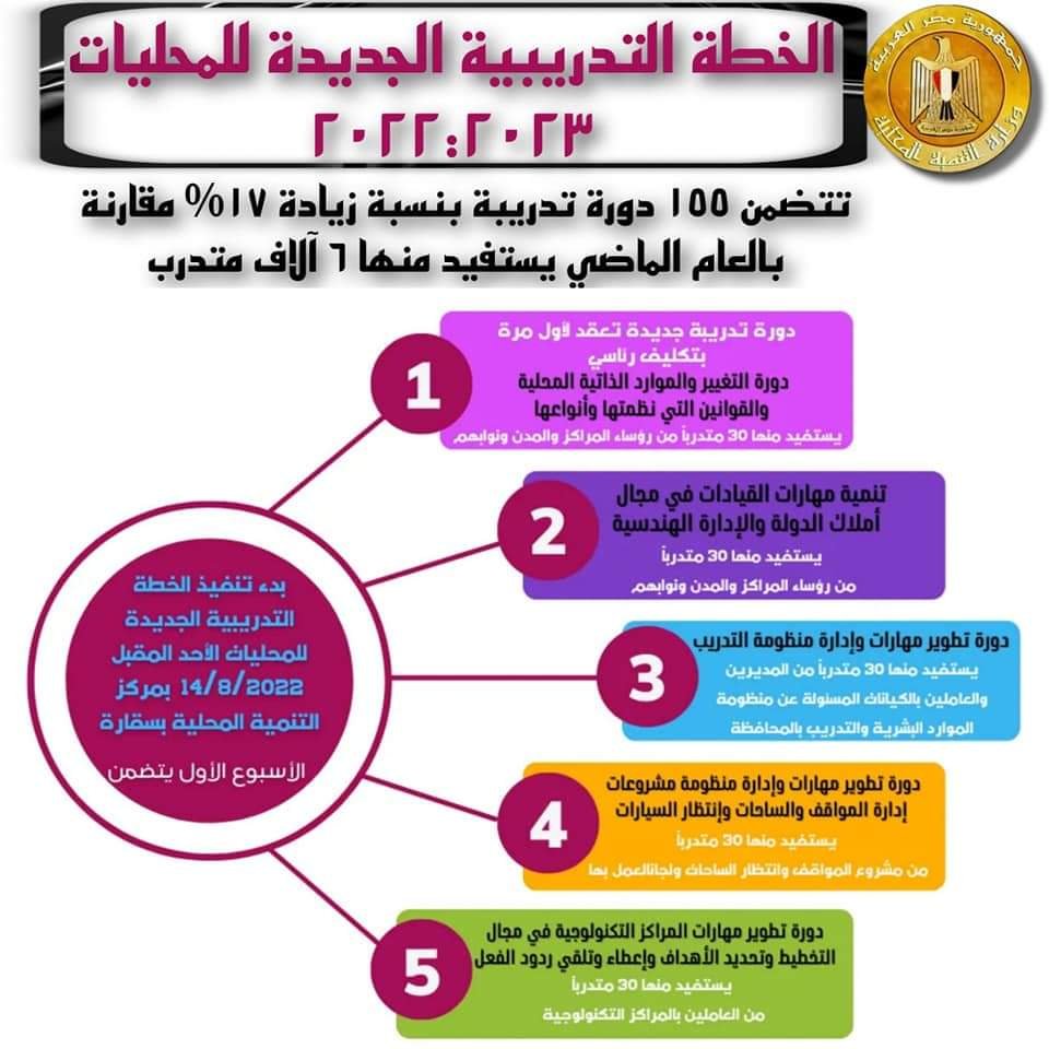 أعلن اللواء محمود شعراوى وزير التنمية المحلية عن بدء انطلاق تنفيذ الخطة التدريبية الجديدة للمحليات للعام المالى 2022/2023 ، يوم الاحد المقبل بمركز التنمية المحلية للتدريب بسقارة ، حيث سيتم افتتاح الخطة بتنفيذ دورة جديدة تعقد لأول مرة بتكليف رئاسي وهي” إدارة التغيير والموارد الذاتية المحلية والقوانين التى نظمتها وانواعها ” ، و يستفيد منها 30 متدرباً من رؤساء المراكز والمدن ونوابهم ، ويشارك فى تنفيذها مع مركز التنمية المحلية ، المسئولون في برنامج تنمية صعيد مصر بالوزارة والبنك الدولى .