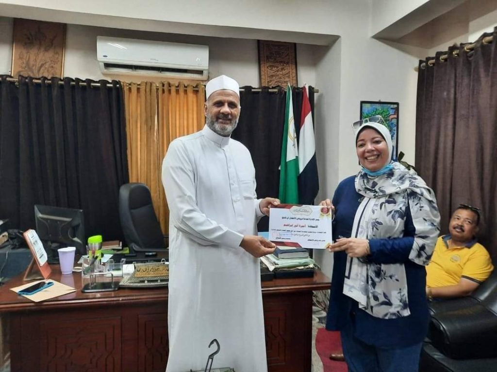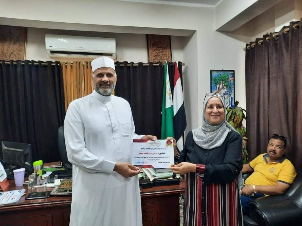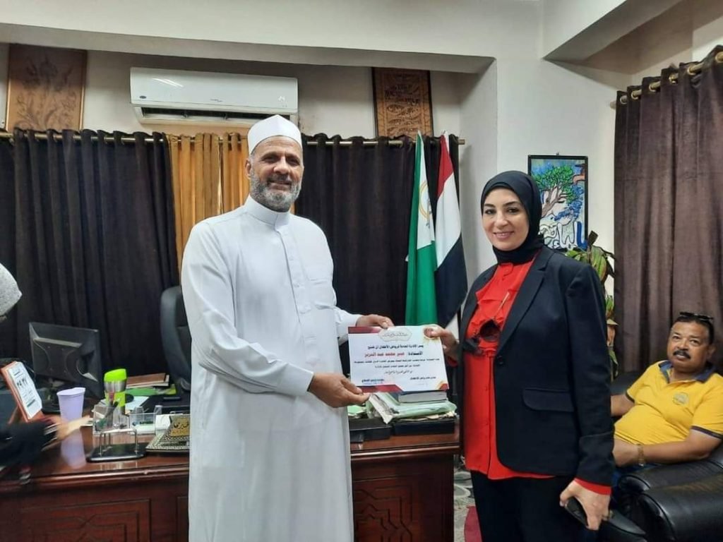 كرم د.سمير أبو الخير، رئيس الإدارة المركزية لمنطقة الجيزة الأزهرية، المعلمة الفعالة والموجهة المتعاونة بمرحلة رياض الأطفال، بمكتبه، بحضور د.شادن الشنبكي، مديرة إدارة رياض الأطفال بالمنطقة.
