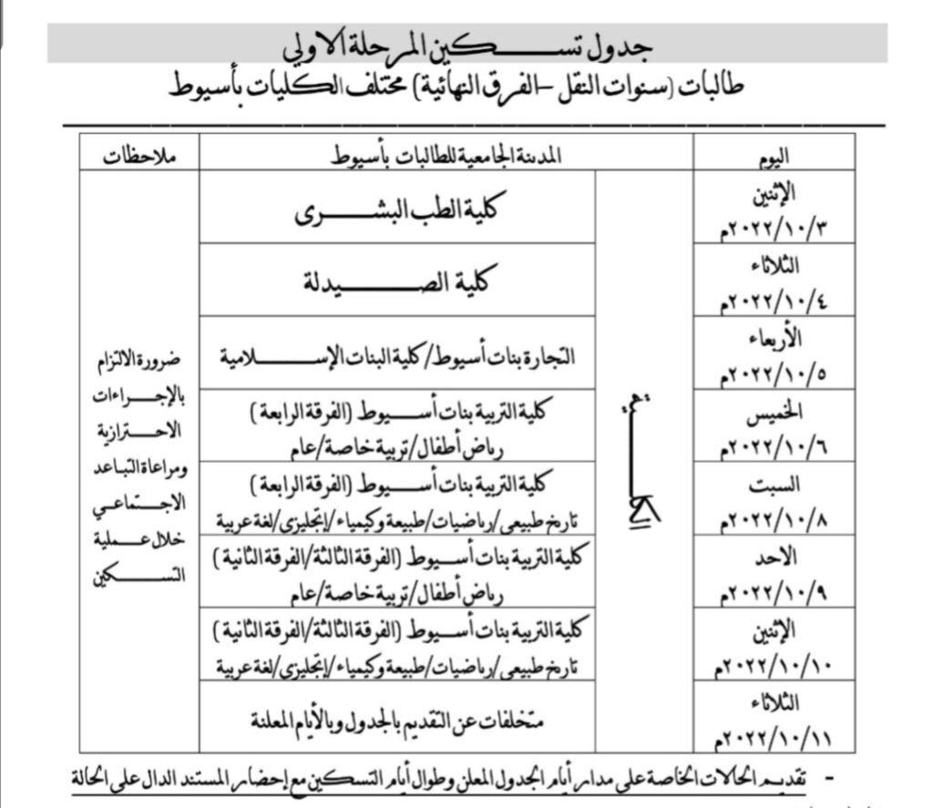 صدق فضيلة الأستاذ الدكتور سلامة داود رئيس جامعة الأزهر على بدء تسكين الطالبات بالمدينة الجامعية بكليات البنات بأسيوط بداية من يوم غد الاثنين الموافق 3 أكتوبر الجاري 2022 م.