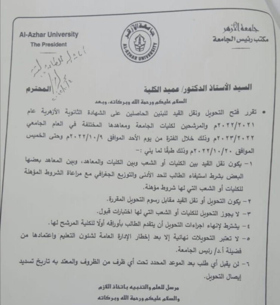 أعلنت جامعة الأزهر عن فتح باب التحويل للبنين بجامعة الأزهر الأحد القادم الموافق 9 أكتوبر الجاري وحتى يوم الخميس الموافق 20 أكتوبر.
