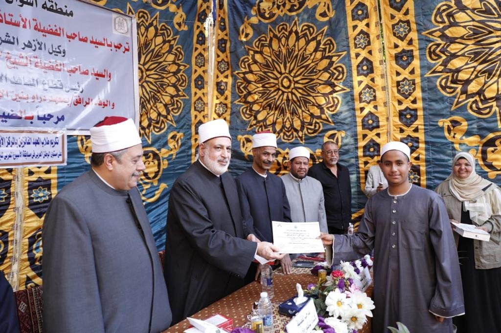 ونقل وكيل الأزهر تحيات فضيلة الإمام الأكبر للطلاب الفائزين وأسرهم ومعلميهم، مؤكدا حرصه على القدوم إلى محافظة أسوان ومدينة «دراو»، تقديرا لإنجازهم، متمنيًا لهم دوام التميز والتفوق، موصيًا جميع طلاب المعهد أن يجتهدوا حتى يكونوا خير خلف لمن سبقوهم بالتميز والنجاح، وأن يكونوا عونا لأمتهم ووطنهم.