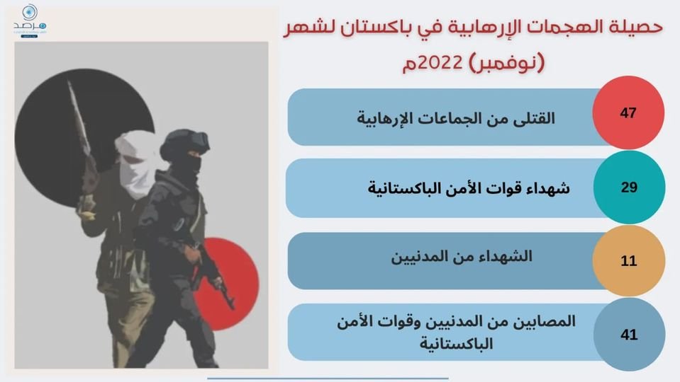 وبناء على ما سجله المرصد من بيانات وأرقام نقلًا عن متابعاته لتصريحات المسؤولين الباكستانيين، يتبين أن شهر نوفمبر من هذا العام قد شهد ارتفاعًا ملحوظًا في عدد الهجمات الإرهابية وبخاصة في المناطق والأقاليم الحدودية لباكستان مقارنة بشهر أكتوبر الذي أسفرت الهجمات الإرهابية خلاله عن مقتل (19) من أفراد الجيش والشرطة و(6) مدنيين.