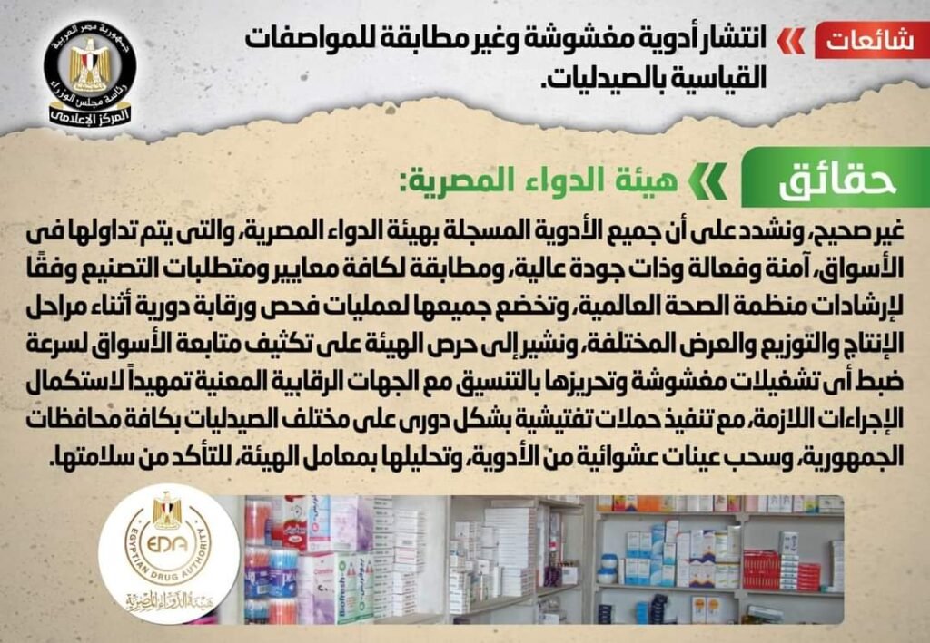 وأكدت الهيئة، أن جميع الأدوية المسجلة بهيئة الدواء المصرية، والتي يتم تداولها في الأسواق، آمنة وفعالة وذات جودة عالية، ومطابقة لكل معايير ومتطلبات التصنيع وفقًا لإرشادات منظمة الصحة العالمية، وتخضع جميعها لعمليات فحص ورقابة دورية خلال مراحل الإنتاج والتوزيع والعرض المختلفة.