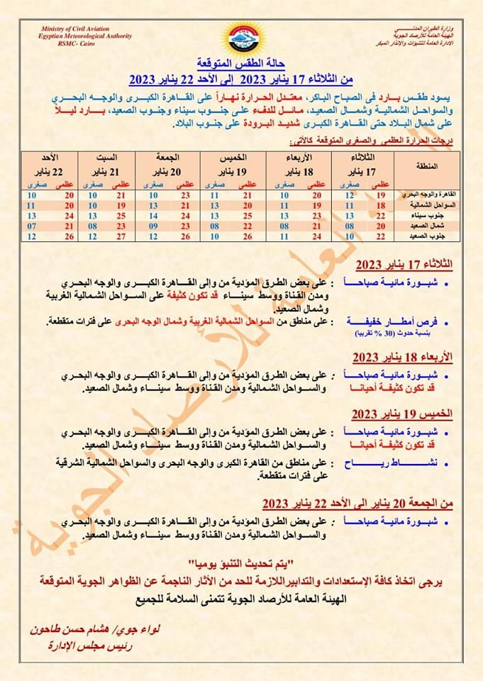 يتوقع خبراء هيئة الأرصاد الجوية، أن يسود غدًا الثلاثاء، طقس بارد في الصباح الباكر، مع شبورة مائية، معتدل نهارًا على شمال البلاد حتى شمال الصعيد، مائل للدفء على جنوب سيناء وجنوب الصعيد.