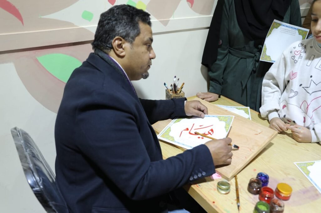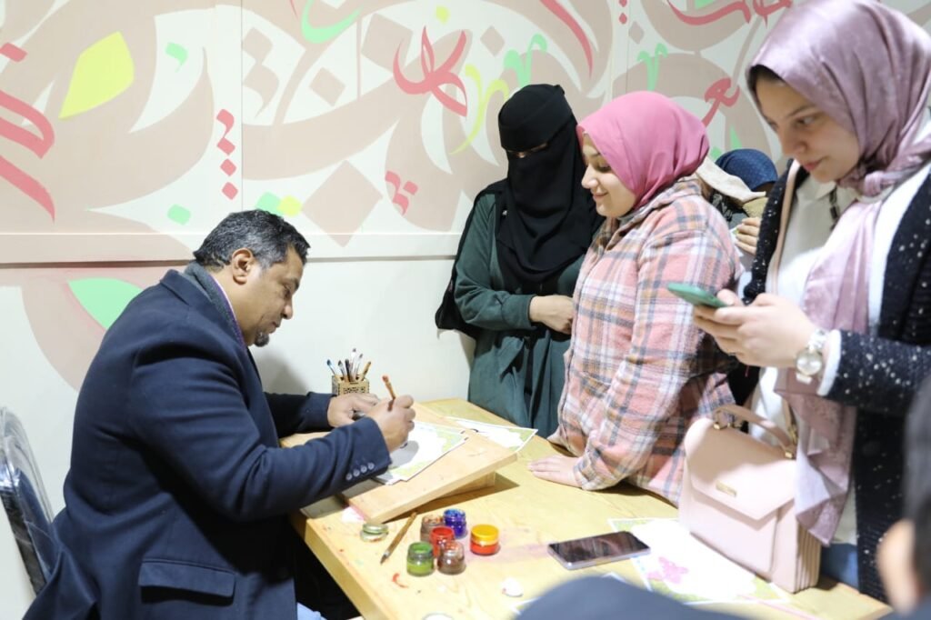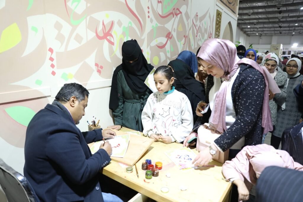 ركن الخط العربي.. يد تكتب والأخرى ترسم البسمة لزوار جناح الأزهر بمعرض الكتاب