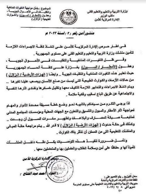 أكدت وزارة التربية والتعليم، في خطابها أنه في ظل التغيرات المناخية والتقلبات في الأحوال الجوية وهطول الأمطار والسيول بغزارة على كافة أنحاء الجمهورية حيث تعتبر هذه التغيرات والتقلبات الجوية وأيضا ( الهزات الأرضية / الزلازل ) من حالات الأزمات والكوارث الطبيعية التي ليست من صنع الإنسان ويصعب علينا تغييرها، فإنه يتم اتخاذ الإجراءات والتدابير اللازمة للتكيف معها وتقليل خسائرها وتفادى آثارها النفسية والاجتماعية عن طريق اتباع أساليب وقائية ملائمة، بالتنبيه بوضع خطة مسبقة محددة الأدوار والمهام لمواجهة آثار الأمطار والسيول والتنسيق والتعاون مع الجهات المعنية ومؤسسات المجتمع المدني لمتابعة صيانة المصارف والبلاعات وتطهير مخرات السيول أن وجدت .