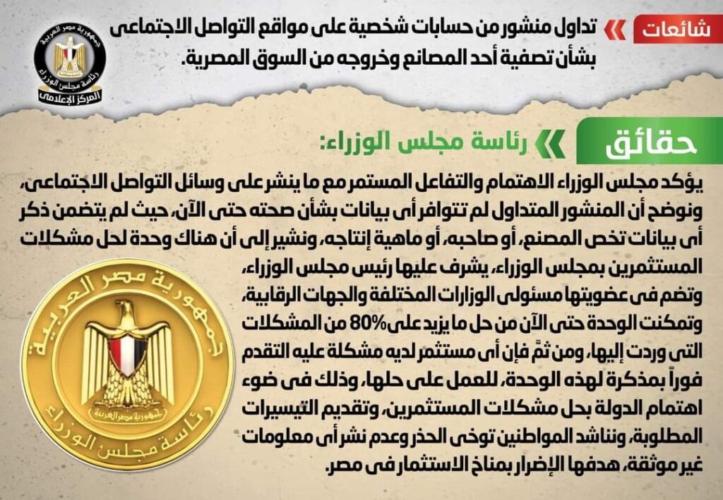 وأوضح مجلس الوزراء أن المنشور المتداول لم تتوافر أي بيانات بشأن صحته حتى الآن، حيث لم يتضمن ذكر أي بيانات تخص المصنع، أو صاحبه، أو ماهية إنتاجه، مشيراً إلى أن هناك وحدة لحل مشكلات المستثمرين بمجلس الوزراء، يشرف عليها رئيس مجلس الوزراء، وتضم في عضويتها مسئولي الوزارات المختلفة والجهات الرقابية، وتمكنت الوحدة حتى الآن من حل ما يزيد على 80% من المشكلات التي وردت إليها، ومن ثمَّ فإن أي مستثمر لديه مشكلة عليه التقدم فوراً بمذكرة لهذه الوحدة، للعمل على حلها، وذلك في ضوء اهتمام الدولة بحل مشكلات المستثمرين، وتقديم التيسيرات المطلوبة، مناشداً المواطنين توخي الحذر وعدم نشر أي معلومات غير موثقة، هدفها الإضرار بمناخ الاستثمار في مصر.