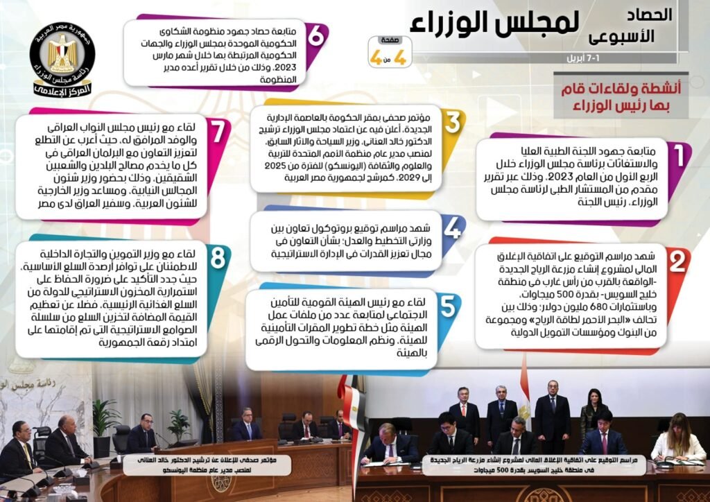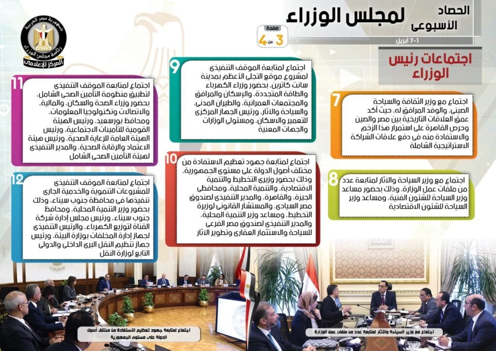 نشر المركز الإعلامي لمجلس الوزراء، تقريراً شمل إنفوجرافات سلط من خلالها الضوء على الحصاد الأسبوعي لمجلس الوزراء، وذلك خلال الفترة من 1 حتى 7 أبريل 2023، والذي تضمن الموافقة على عدد من القرارات، فضلاً عن الاجتماعات واللقاءات التي عقدها الدكتور مصطفى مدبولي، رئيس مجلس الوزراء، بالإضافة إلى ما قام به سيادته من أنشطة.
