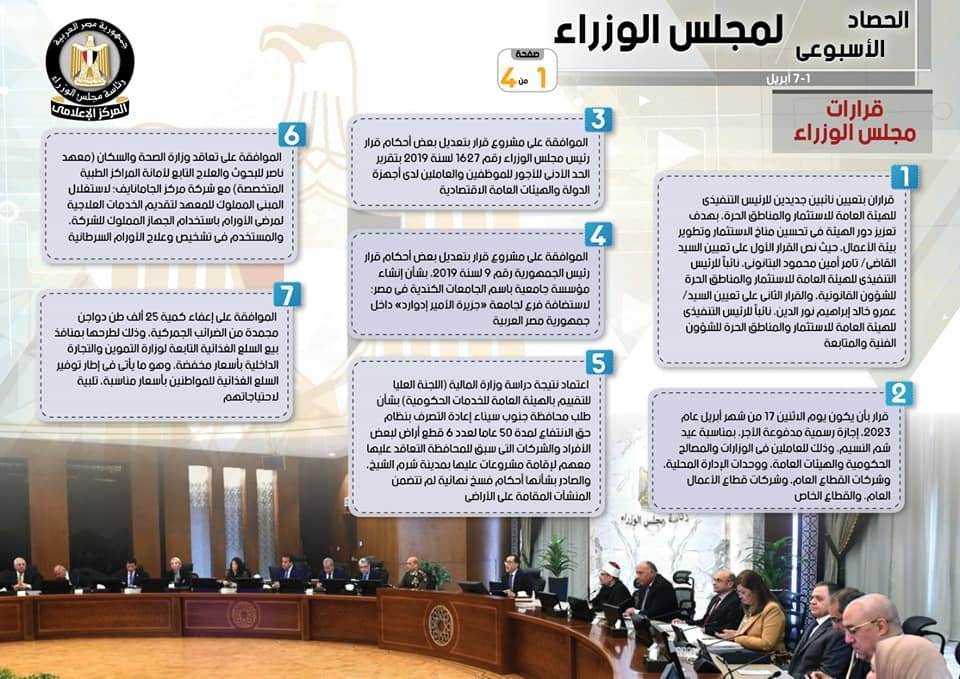 وجاء في التقرير أنه تم إصدار عدد من القرارات وتشمل قرارين بتعيين نائبين جديدين للرئيس التنفيذي للهيئة العامة للاستثمار والمناطق الحرة، بهدف تعزيز دور الهيئة في تحسين مناخ الاستثمار وتطوير بيئة الأعمال، حيث نص القرار الأول على تعيين القاضي تامر أمين محمود البتانوني، نائباً للرئيس التنفيذي للهيئة العامة للاستثمار والمناطق الحرة للشؤون القانونية، والقرار الثاني على تعيين عمرو خالد إبراهيم نور الدين، نائباً للرئيس التنفيذي للهيئة العامة للاستثمار والمناطق الحرة للشؤون الفنية والمتابعة، بالإضافة إلى قرار بأن يكون يوم الاثنين 17 من شهر أبريل عام 2023، إجازة رسمية مدفوعة الأجر، بمناسبة عيد شم النسيم، وذلك للعاملين في الوزارات والمصالح الحكومية والهيئات العامة، ووحدات الإدارة المحلية، وشركات القطاع العام، وشركات قطاع الأعمال العام، والقطاع الخاص، فضلاً عن الموافقة على مشروع قرار بتعديل بعض أحكام قرار رئيس مجلس الوزراء رقم 1627 لسنة 2019 بتقرير الحد الأدنى للأجور للموظفين والعاملين لدى أجهزة الدولة والهيئات العامة الاقتصادية، إلى جانب الموافقة على مشروع قرار بتعديل بعض أحكام قرار رئيس الجمهورية رقم 9 لسنة 2019، بشأن إنشاء مؤسسة جامعية باسم الجامعات الكندية في مصر؛ لاستضافة فرع لجامعة “جزيرة الأمير إدوارد” داخل جمهورية مصر العربية، كما تم اعتماد نتيجة دراسة وزارة المالية (اللجنة العليا للتقييم بالهيئة العامة للخدمات الحكومية) بشأن طلب محافظة جنوب سيناء إعادة التصرف بنظام حق الانتفاع لمدة 50 عاما لعدد 6 قطع أراض لبعض الأفراد والشركات التي سبق للمحافظة التعاقد عليها معهم لإقامة مشروعات عليها بمدينة شرم الشيخ، والصادر بشأنها أحكام فسخ نهائية لم تتضمن المنشآت المقامة على الأراضي.