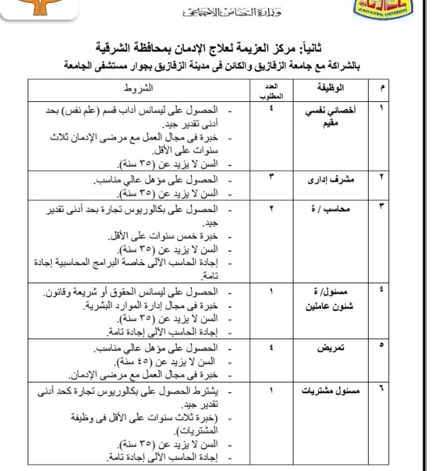 أعلن صندوق مكافحة وعلاج الإدمان والتعاطي، التابع لوزيرة التضامن الاجتماعي حاجته لشغل 280 وظيفة بنظام عقود العمل محددة المدة مع إحدى المؤسسات الأهلية في مراكز العزيمة لعلاج الإدمان الجديدة، في 4 محافظات الشرقية، دمياط، سوهاج وأسوان.
