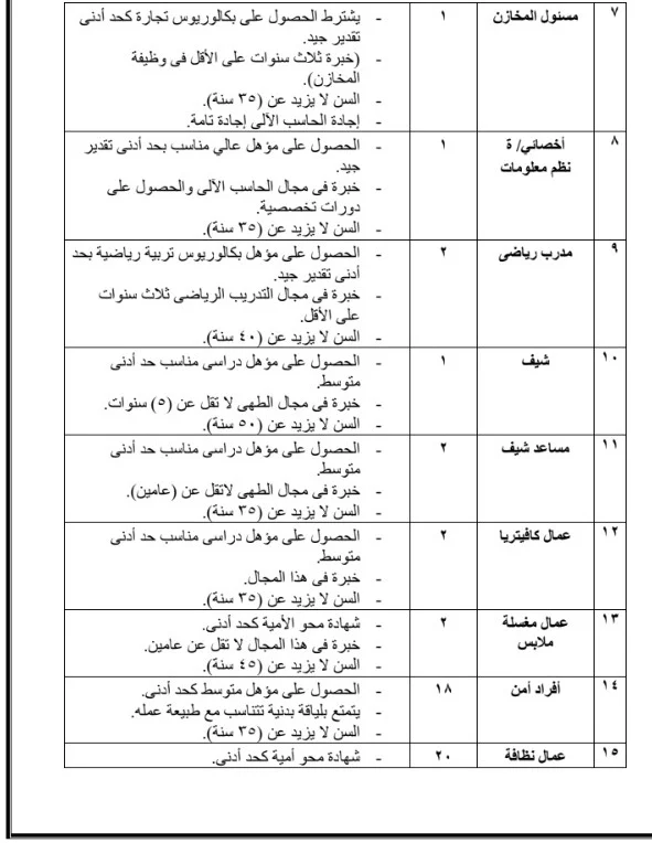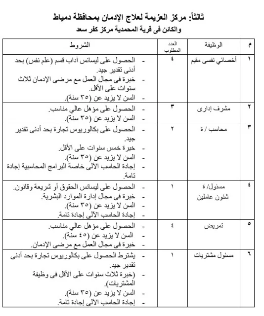 وأوضح صندوق مكافحة الإدمان، عبر موقعه الرسمي، أن الوظائف الشاغرة جاءت كالتالي: مدير إداري، نائب مدير إداري، أخصائي نفسي مقيم، مشرف إداري، محاسب، مسؤول شئون عاملين، تمريض، مسؤول مشتريات، مسؤول مخازن، أخصائي نظم معلومات، مدرب رياضي، شيف، مساعد شيف، عمال، عمال نظافة، أفراد أمن، موظف استقبال.
