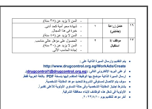 أوضح صندوق مكافحة الإدمان، على أن يتم إرسال السيرة الذاتية موضح بها الوظيفة المتقدم إليها بنسخة PDF باللغة العربية فقط، على http://www.drugcontrol.org.eg/WorkAds/Create أو على البريد الإلكتروني التالي: «drugcontrol1@drugcontrol.org.eg»، على أن يتم الاتصال لمستوفي الشروط لتحديد موعد المقابلة الشخصية ويشترط اجتياز المقابلة الشخصية وفى حالة التساوي الأولوية للأعلى تقديرا، منوهًا أن آخر موعد للتقديم يوم 10/8/2023.