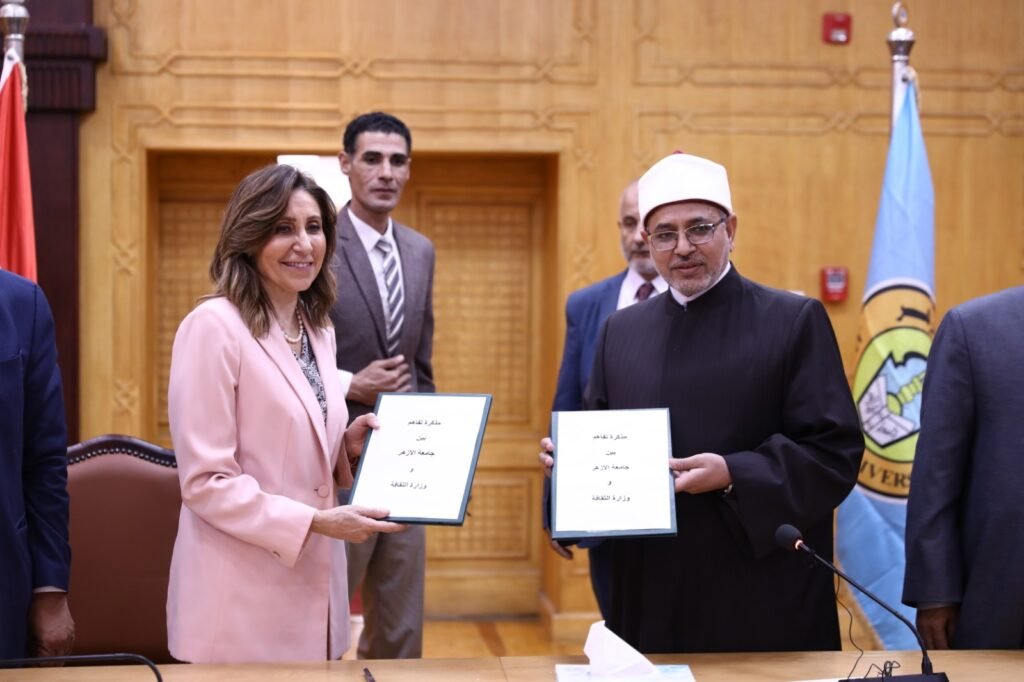 وقعت الدكتورة نيفين الكيلاني، وزيرة الثقافة، والدكتور سلامة جمعة داود، رئيس جامعة الأزهر، بروتوكول تعاون بين الوزارة والجامعة، يهدف إلى تعزيز وتدعيم أوجه الشراكة الإستراتيجية المرتبطة بتنفيذ محور بناء الإنسان المصري، وصقله ثقافيًّا وتوعويًّا، بما يخدم تأصيل مفاهيم الوسطية والتسامح والتعايش السلمي بين الجميع.