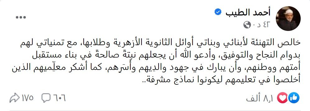 وقال في منشوره: «خالص التهنئة لأبنائي وبناتي أوائل الثانوية الأزهرية وطلابها، مع تمنياتي لهم بدوام النجاح والتوفيق، وأدعو الله أن يجعلهم نبتةً صالحةً في بناء مستقبل أمتهم ووطنهم».