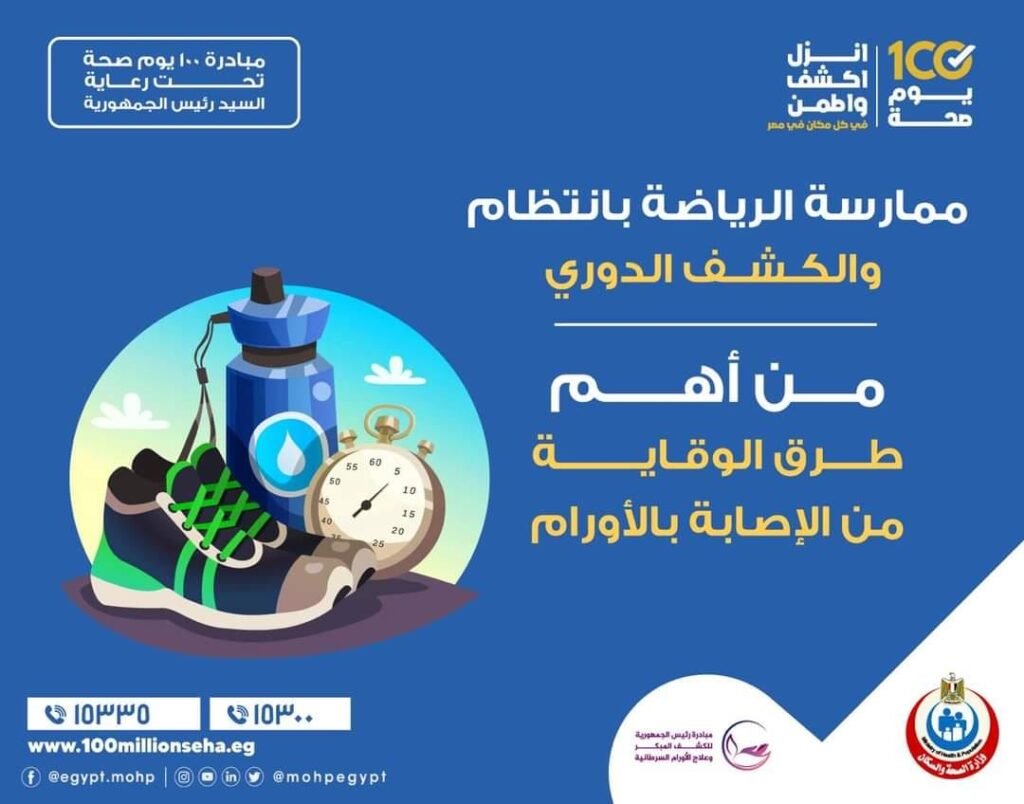 كشفت وزارة الصحة والسكان عن نصيحة مهمة للوقاية من السرطان، موضحة أن ممارسة الرياضة بانتظام تساعد في الوقاية من الإصابة بالأورام السرطانية،