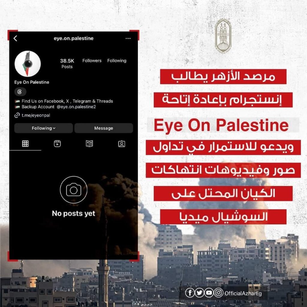 يطالب مرصد الأزهر لمكافحة التطرف، موقع انستجرام‏، بإعادة إتاحة منصة ‏Eye On ‎Palestine‏، مؤكدًا أن حجب المنصة يتعارض مع كل معايير حرية ‏التعبير، وأنَّ المنصة لم تقم سوى بعرض الحقيقة التي يحاول البعض إخفاءها؛ من ‏استهداف الأطفال والسيدات وتنفيذ إبادة شاملة لكل مظاهر الحياة في غـزة، مشيرًا إلى ‏أنَّ استمرار حجب المنصة يُثْبِتُ تورط ‏meta‏ بشكل رئيسي في إخفاء الحقائق وبيان ‏حقيقة الموقف في غـزة، وأنَّها تسعى للسيطرة على تدفق المعلومات القادمة من غـزة ‏تضامًنا مع الكيان الصـهـيوني حتى يستمرَّ في ارتكاب مزيد من جرائم الحرب دون أن ‏يشعر به أحدٌ، داعيا الجميع بالاستمرار في تداول صور وفيديوهات انتهاكات الكيان ‏المحتل على مواقع التواصل الاجتماعي -حتى مع تقييد وصول المحتوى الخاص ‏بفلسـطين – وأنَّ ذلك يساعد في رصدِ جرائمه وفضحه أمام العالم. ‏