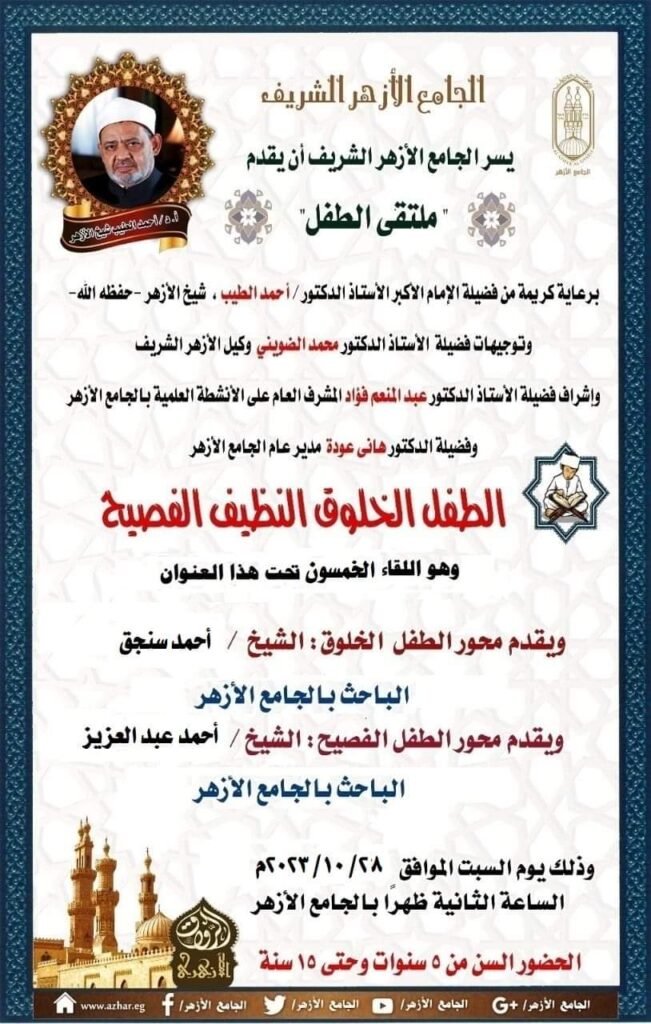 وأكدَّ الدكتور هاني عودة، مدير عام الجامع الأزهر، أن ملتقى ” الطفل الخلوق والنظيف والفصيح”، يعقد يوم السبت من كل أسبوع بالجامع الأزهر، مشيراً إلى أن الهدف منه تعليم وتربية وتوعية الأجيال القادمة بالأخلاق والآداب الإسلامية، وشرحها بطريقة سهلة وميسرة بمنهج الأزهر الوسطي المعتدل، لافتاً إلى أنه من المقرر أن يتم تنفيذه في بعض المحافظات ، وذلك ليعم النفع بجميع أنحاء الوطن.