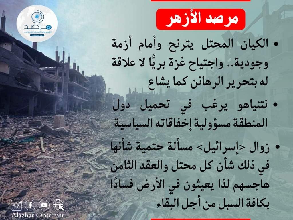 مرصد الأزهر:المسؤولون داخل الكيان الصـهـيوني على أتم الاستعداد للتضحية بالرهائن من أجل البقاء في السلطة فالدم لغتهم الوحيدة داخليًّا ومع الفلسطينيين