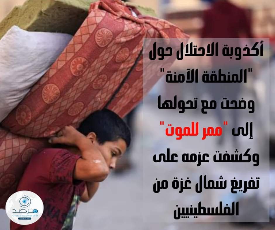 “مرصد الأزهر”: أكذوبة الاحتلال حول “المنطقة الآمنة” وضحت مع تحولها إلى “ممر للموت” وكشفت عزمه على تفريغ شمال غزة من الفلسطينيين