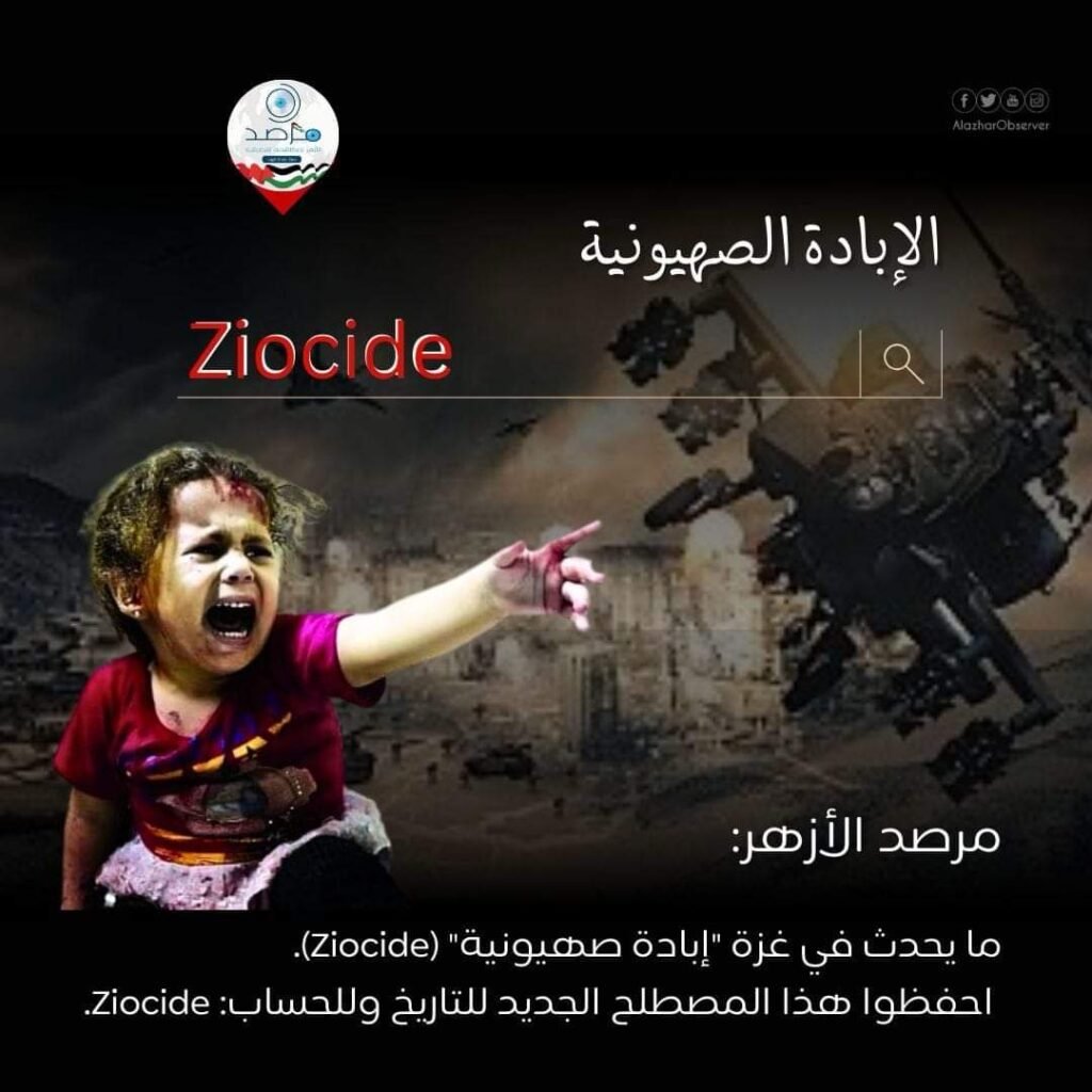 والبداية بمصطلح Ziocide… ومعناه: “الإبادة الصهيونية”، المصطلح منحوت من كلمتي Zionist (صهيوني) وgenocide (الإبادة الجماعية)؛ أي الإبادة الجماعية التي يرتكبها صهاينة، الصها ينة جديرون بهذا الوصم، لأن جرائمهم فاقت الوصف.