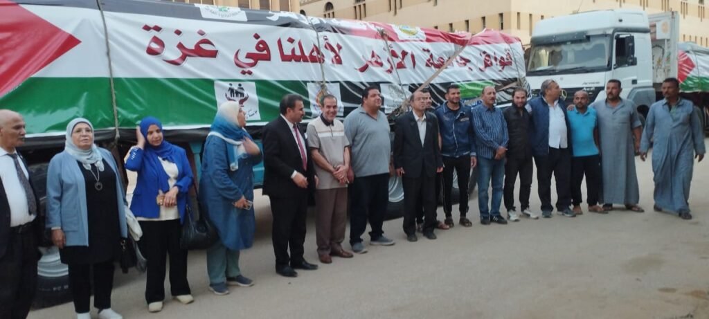 جدير بالذكر أن القافلة انطلقت في طريقها إلى معبر رفح، ومنه إلى قطاع غزة، وكان في وداعها فضيلة الدكتور سلامة داود، رئيس الجامعة، وفضيلة الدكتور نظير عياد، أمين عام مجمع البحوث الإسلامية، والأستاذ محمد عبد الخالق، أمين عام الجامعة، هذا وتحتوي القافلة التي سيرتها لجنة خدمة المجتمع برئاسة الدكتور محمود صديق، نائب رئيس الجامعة الدراسات العليا والبحوث، والمكونة من 12 شاحنة كبرى؛ تحتوي على مواد غذائية وطبية وأدوية وبطاطين وملابس وماء وغير ذلك مما يحتاجه الشعب الفلسطيني الشقيق.