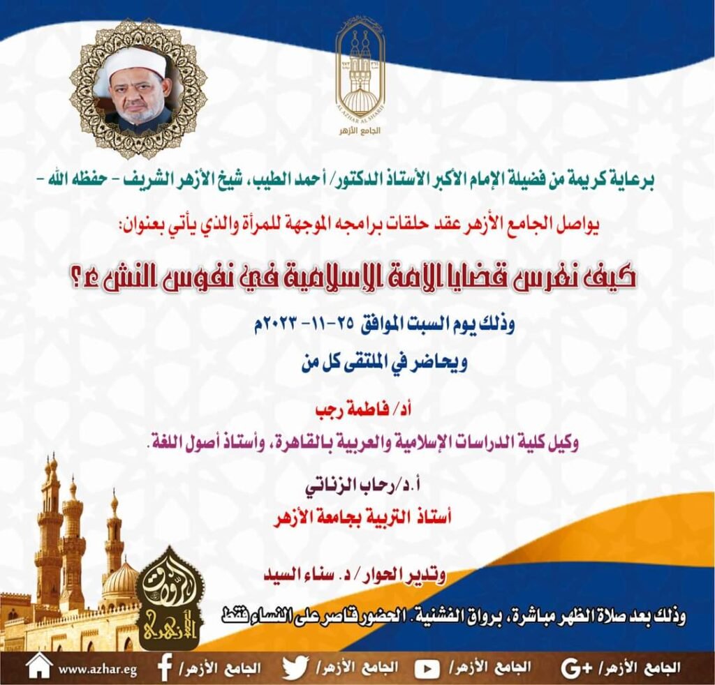 وتأتي رابع حلقات الموسم الثامن تحت عنوان: “كيف نغرس قضايا الأمة في نفوس النشء”، ويحاضر فيها كلٌّ من د.فاطمة رجب، وكيل كلية الدراسات الإسلامية والعربية بالقاهرة وأستاذ أصول اللغة، ود.رحاب الزناتي، أستاذ التربية بجامعةالأزهر، وتدير الحوار د.سناء السيد، الباحثة بالجامع الأزهر الشريف.