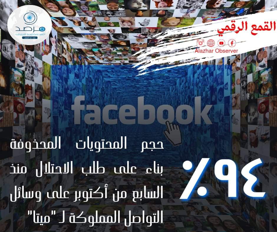 أكد مرصد الأزهر، عبر صفحته الرسمية بموقع التواصل الإجتماعي فيسبوك، أن مجلة “فوربس” كشفت في تقريرها الصادر مؤخرًا عن إرسال مكتب المدعي العام للكيان الصهيوني -منذ السابع من أكتوبر- ما يقرب من 9500 طلب إلى شركة “ميتا” التي تملك كل من الفيسبوك وإنستجرام، وتيك توك، لحذف المحتوى المتعلق بالحرب الغاشمة على قطاع غزة، ونتيجة لتلك الطلبات، فإن ما يقرب من 94% من المحتوى تم حذفه.