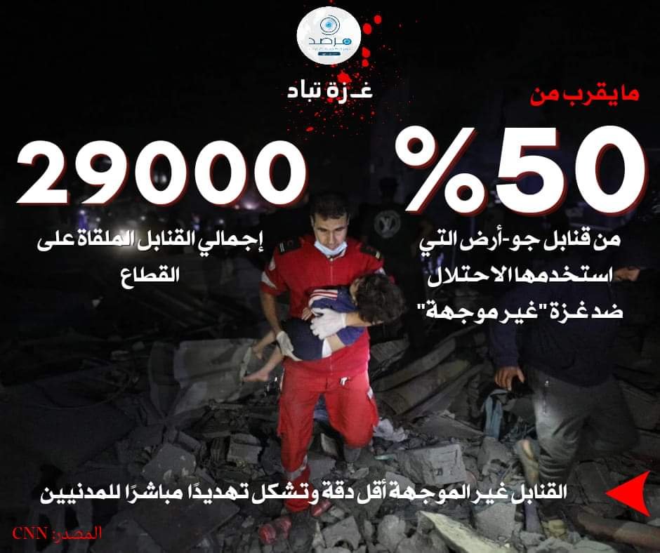 فما بين 40 إلى 45% من إجمالي قنابل جو-أرض المقدرة بـ (29 ألف قنبلة) والملقاة على قطاع غزة منذ السابع من أكتوبر كانت غير موجهة “عشوائية” وهو ما تسبب في سقوط نحو 20 ألف شهيد بخلاف آلاف المصابين والمفقودين، ما يفضح مزاعم الاحتلال وشركائه.