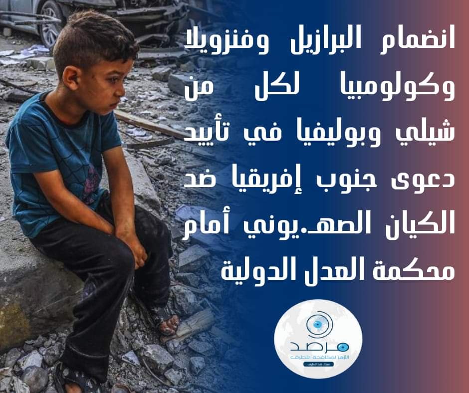 “مرصد الأزهر”: انضمام البرازيل وفنزويلا وكولومبيا لكل من شيلي وبوليفيا في تأييد دعوى جنوب إفريقيا ضد الكيان ‏الصهيوني أمام محكمة العدل الدولية ‏