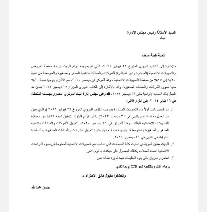 وقال البنك في خطاب للقطاع المصرفي إن تطبيق القرار الإلزامي سيكون في 31 ديسمبر 2024، مانحًا البنوك مطلق الحرية في استيفاء كافة الضمانات التي تتناسب مع التسهيلات الائنمانية الممنوحة في ضوء الدراسات الائتمانية المعدة للعملاء والحصول على شيكات إذا لزم الأمر.