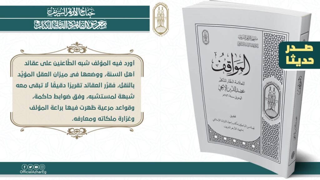 - كتاب «المواقف» للقاضي عضد الدين الإيجي، أورد فيه المؤلف شبه الطاعنين على عقائد أهل السنة، ووضعها في ميزان العقل المؤيد بالنقل، فقرر العقائد تقريرًا دقيقًا لا تبقى معه شبهة لمستشبه، وفق ضوابط حاكمة، وقواعد مرعية ظهرت فيها براعة المؤلف وغزارة ملكاته ومعارفه.