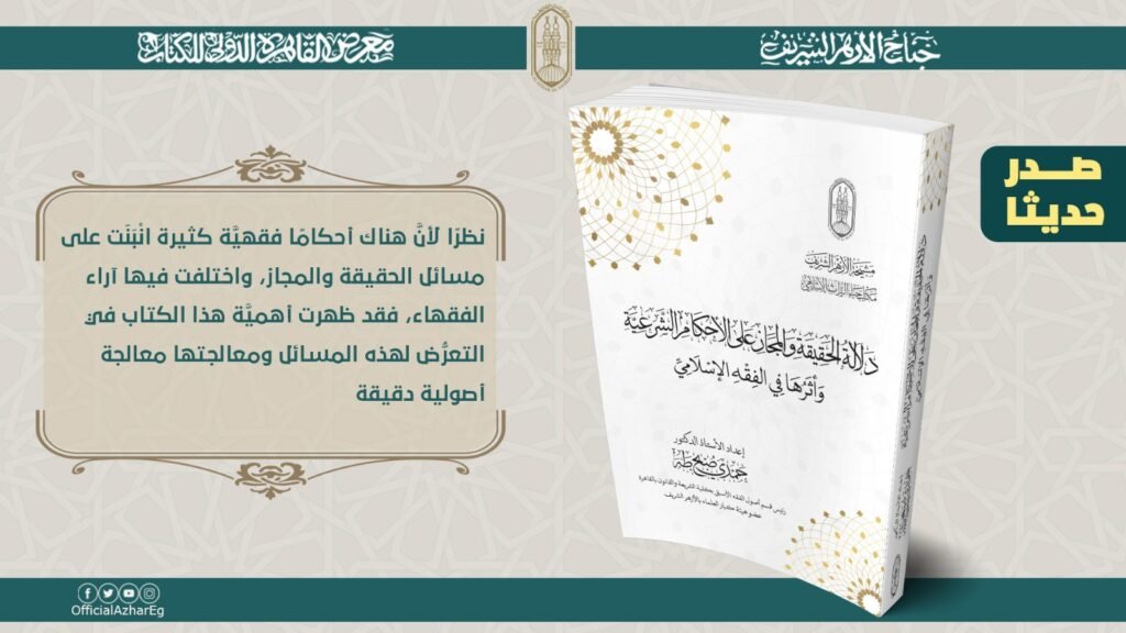 - كتاب “دلالة الحقيقة والمجاز على الأحكام الشرعية وأثرها في الفقه الإسلامي”، بقلم أ.د/ حمدي صبح طه، عضو هيئة كبار العلماء بالأزهر، يتناول تقسيم اللفظ باعتبار تعدد معناه إلى حقيقةٍ ومجازٍ؛ إذ اللفظ في هذا التقسيم يكون حقيقة في المعنى الموضوع له، ومجازًا في المعنى الذي لم يوضع له، ونظرًا لأن هناك أحكامًا فقهية كثيرة انْبَنَت على مسائل الحقيقة والمجاز، واختلفت فيها آراء الفقهاء، فقد ظهرت أهمية هذا الكتاب في التعرُّض لهذه المسائل ومعالجتها معالجة أصولية دقيقة.