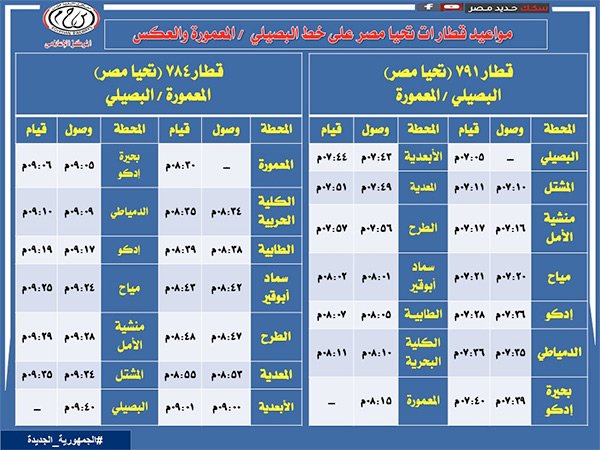 أعلنت الهيئة القومية لسكك حديد مصر، عن تعديل ميعاد قطار 791 ركاب (البصيلي / المعمورة) ليقوم الساعة 07:05 مساءً بدلًا من الساعة 05:30 مساءً وكذلك تعديل ميعاد قطار 784 ركاب (المعمورة / البصيلي) ليقوم الساعة 08:30 مساءً بدلًا من الساعة 07:10 مساءً وذلك لمقابلة قطارى 640 و4210 آخر قطارين بكل من المعمورة والبصيلى وذلك اعتبارًا من اليوم الخميس طبقاً للجداول المرفقة.