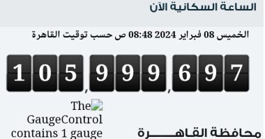 تظهر الساعة السكانية المعلقة على مبني الجهاز المركزي للتعبئة العامة والإحصاء، والمربوطة بقاعدة بيانات وزارة الصحة قرب وصول عدد سكان مصر بالداخل إلى 106 ملايين نسمة.
