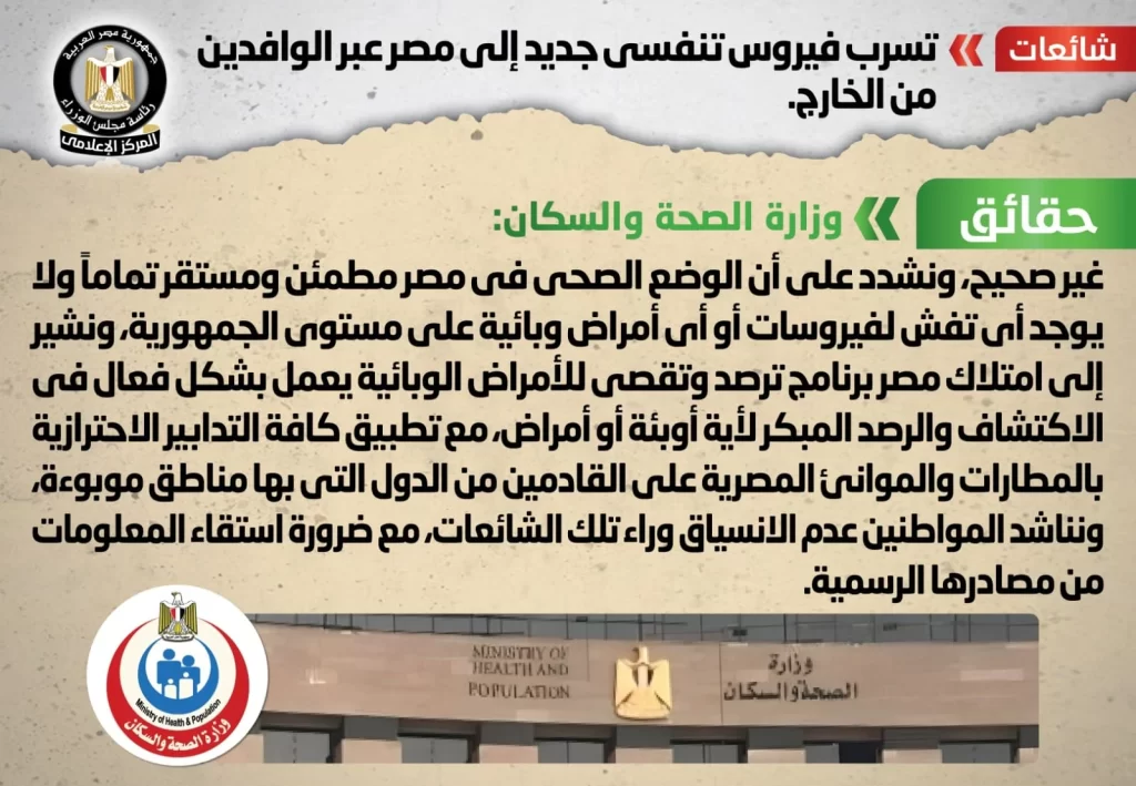 وأكدت وزارة الصحة والسكان، أنه لا صحة لتسرب فيروس تنفسي جديد إلى مصر عبر الوافدين من الخارج، مشددةً على أن الوضع الصحي في مصر مطمئن ومستقر تمامًا ولا يوجد أي تفش لفيروسات أو أي أمراض وبائية على مستوى الجمهورية، مشيرةً إلى امتلاك مصر برنامج ترصد وتقصي للأمراض الوبائية يعمل بشكل فعال في الاكتشاف والرصد المبكر لأية أوبئة أو أمراض، مع تطبيق كافة التدابير الاحترازية بالمطارات والموانئ المصرية على القادمين من الدول التي بها مناطق موبوءة، مناشدةً المواطنين عدم الانسياق وراء تلك الشائعات، مع ضرورة استقاء المعلومات من مصادرها الرسمية.